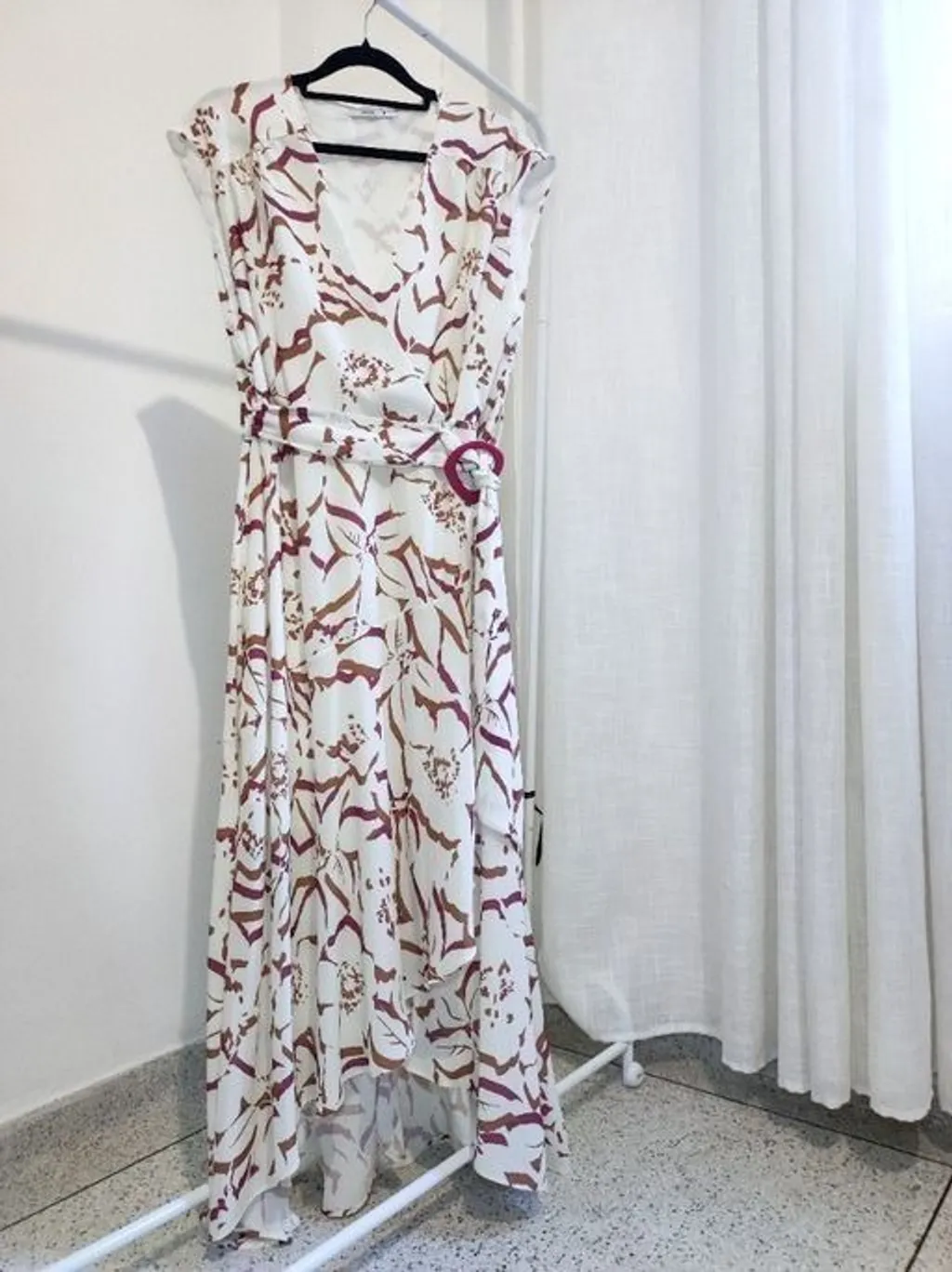 vestido cruzado branco com flores, o cinto pode ser amarrado como quiser, tamanho m, da cortelle (marca da renner) 94 cm de peito 80 cm de cintura 120 cm de comprimento no ponto médio (mais curto na frente e mais comprido atrás) -novo-