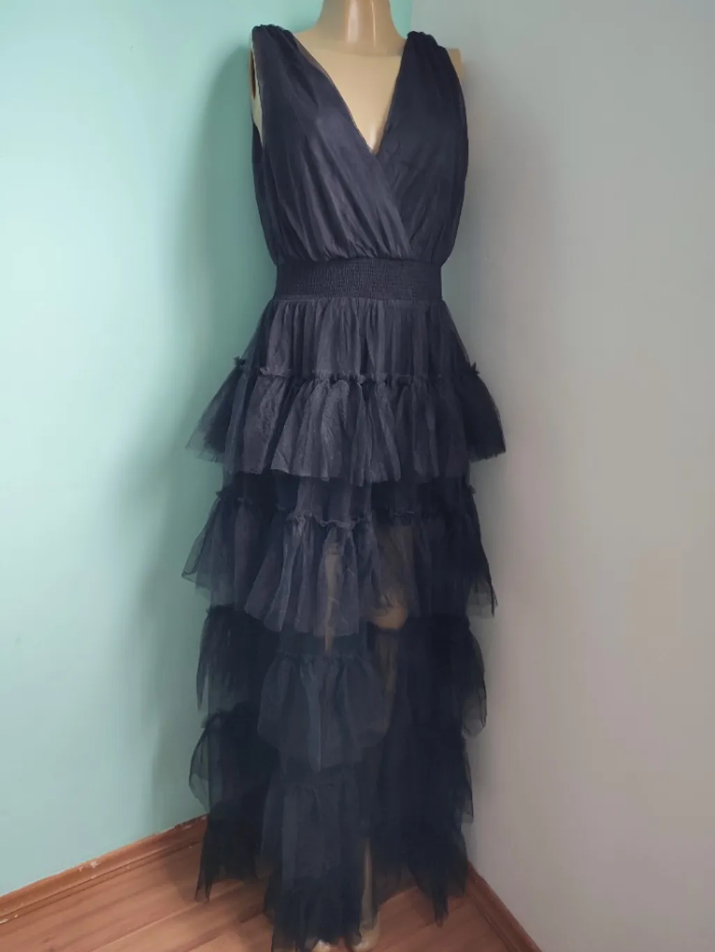 Vestido longo ilusão com babados em tule em camadas