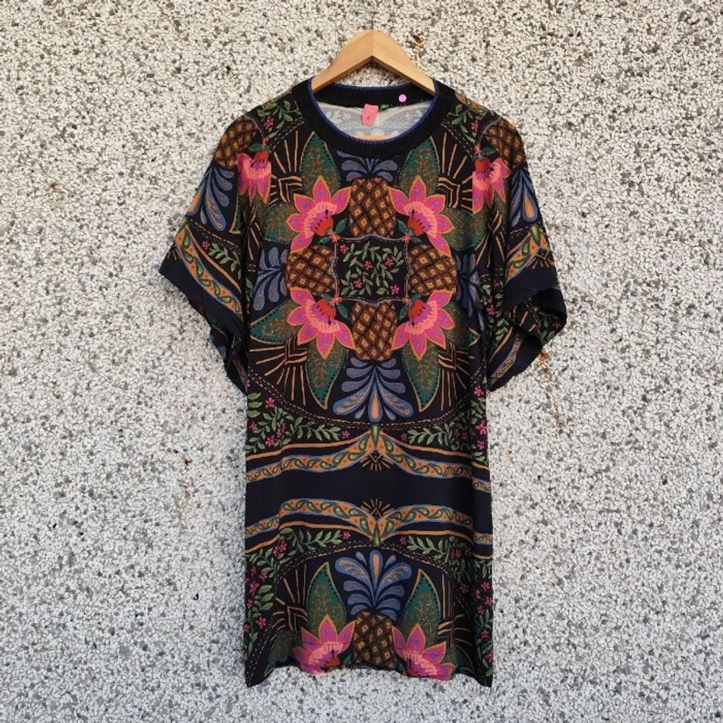 Vestido camisetão preto, com estampa colorida de flores e abacaxis. Com gola em tricô e mangas amplas. Marca Farm, tamanho P. Composição: 100% viscose. Medidas: 84cm busto / 82cm cintura / 90cm quadril / 84cm comprimento.