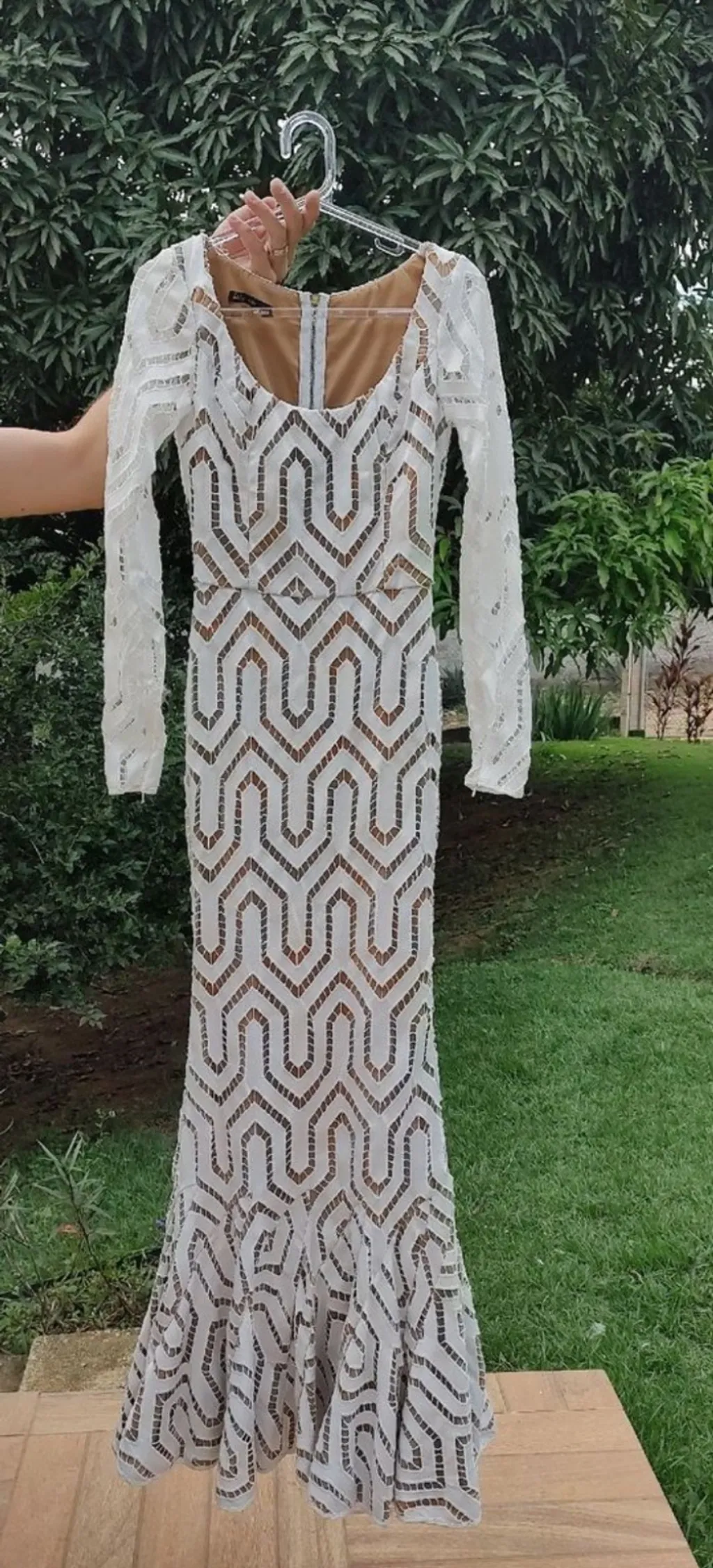 Vestido fabulous agilitá, com modelagem longa e sofisticada, mangas longas e decote que valoriza o colo. o trabalho em renda geométrica traz elegância e leve transparência, realçando a silhueta. ideal para casamentos, jantares formais, festas noturnas, eventos de gala e celebrações especiais.