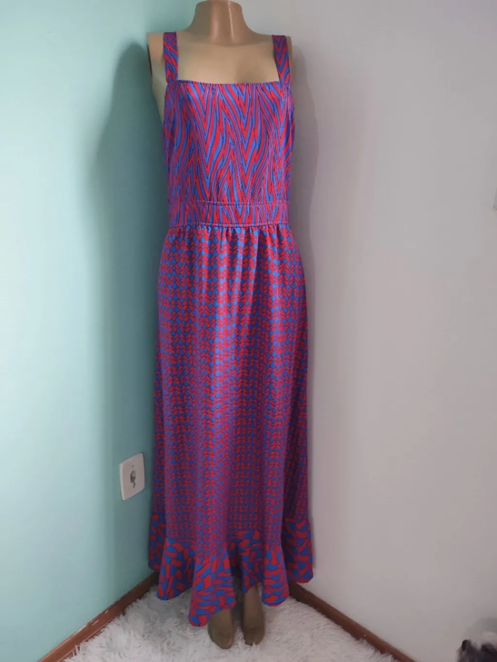 Esse vestido longo vibrante com estampa geométrica e animal print em azul e vermelho é uma peça que se destaca em qualquer ocasião. Ele possui alças largas, um decote quadrado e um detalhe de babado na barra que traz movimento ao look
