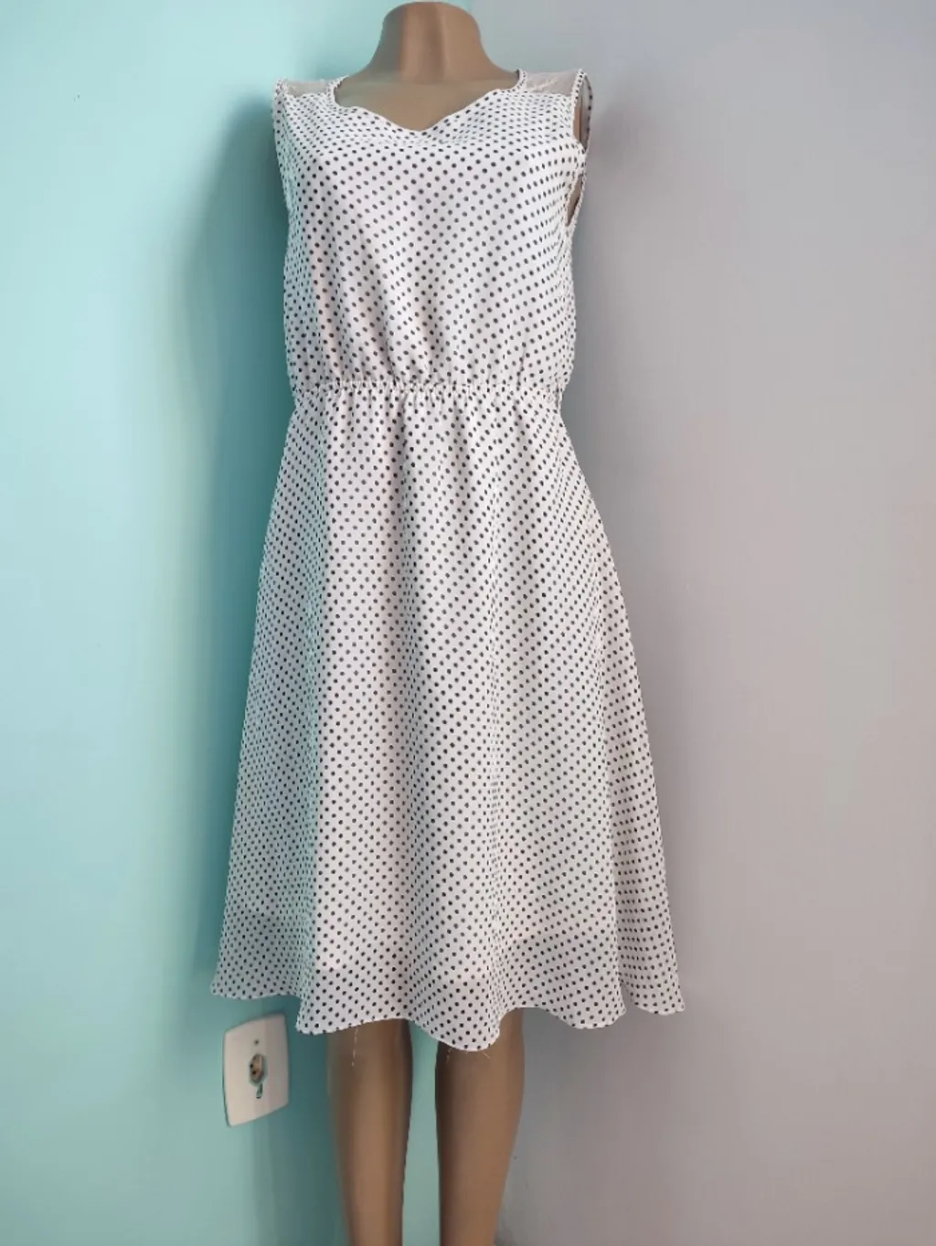 vestido branco com estampa de poá (bolinhas) pretas, um clássico atemporal da moda. Ele apresenta um design sem mangas, decote arredondado e uma cintura elástica que define a silhueta.