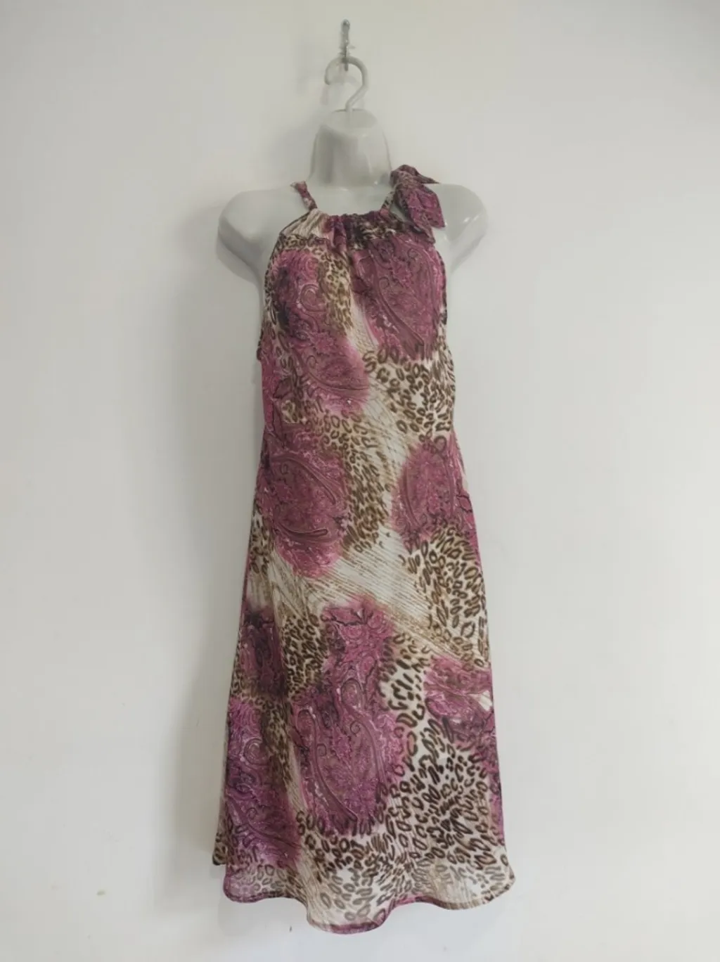 CONFIRA AS MEDIDAS ABAIXO: Possui gola halter neck com amarração no pescoço, forro e tecido leve e fluído. Usad, porém em excelente estado de conservação. Tamanho: M Cor: Bege, marrom e rosa Tecido: Poliéster Condição da peça: 10/10 Medidas: Busto: 98cm Cintura: 90cm Quadril: 108cm Comprimento: 104cm