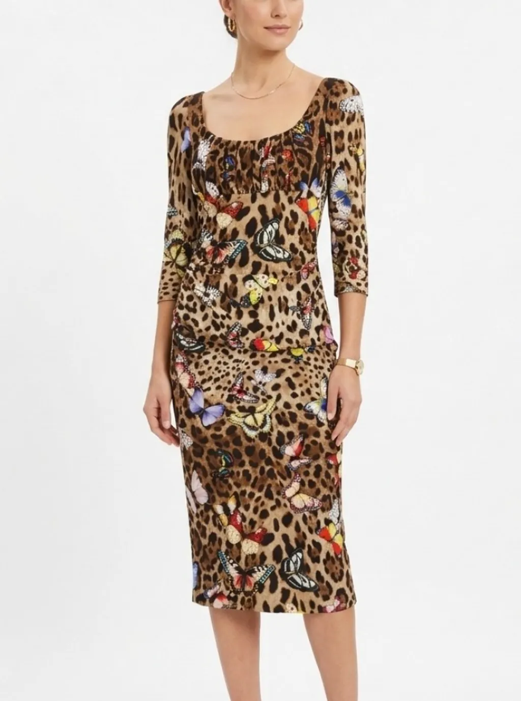 Vestido Midi que funde duas das assinaturas mais emblemáticas da Dolce&Gabbana: a estampa animalier e as borboletas multicoloridas. Uma peça que exala a feminilidade audaciosa e a energia vibrante da marca italiana. Tam.40 Marca: Dolce&Gabbana Excelente Estado Valor de Mercado: €1,890 = R$11.340,00