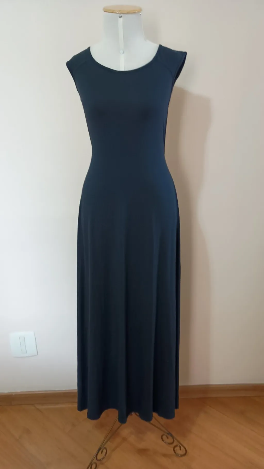 vestido longo preto da marca Animale, tamanho P da etiqueta, mas serve m. feito em malha. Tem 1,32 m de comprimento, 90cm de busto, a cintura estica até 92 cm e tem 100 cm de quadril.