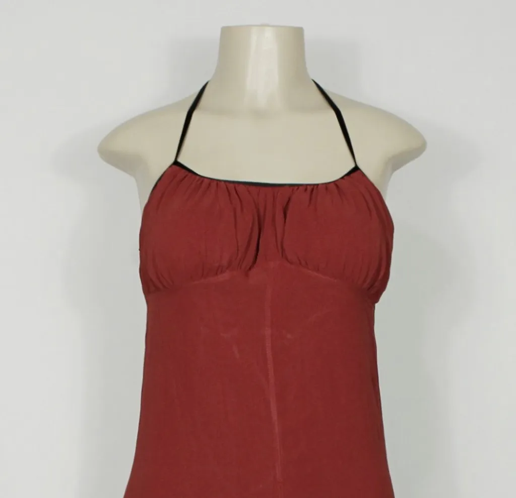 Cor: vermelho e preto Tecido: chiffon, não estica Modelo: feminino, super midi a longo (depende da altura), assimétrico Fechamento: no pescoço e nas costas Forro: sim Peça dos anos 2000 Para se ter ideia do comprimento, a maneca imita uma pessoa em torno de 1,70 de altura. Peça em perfeitas condições e sem avarias. Medidas: Busto (circunferência): 84 cm Cintura (circunferência): 74 cm Quadril (circunferência): 104 cm Comprimento da peça: 132 cm (sem contar as alças que são reguáveis)