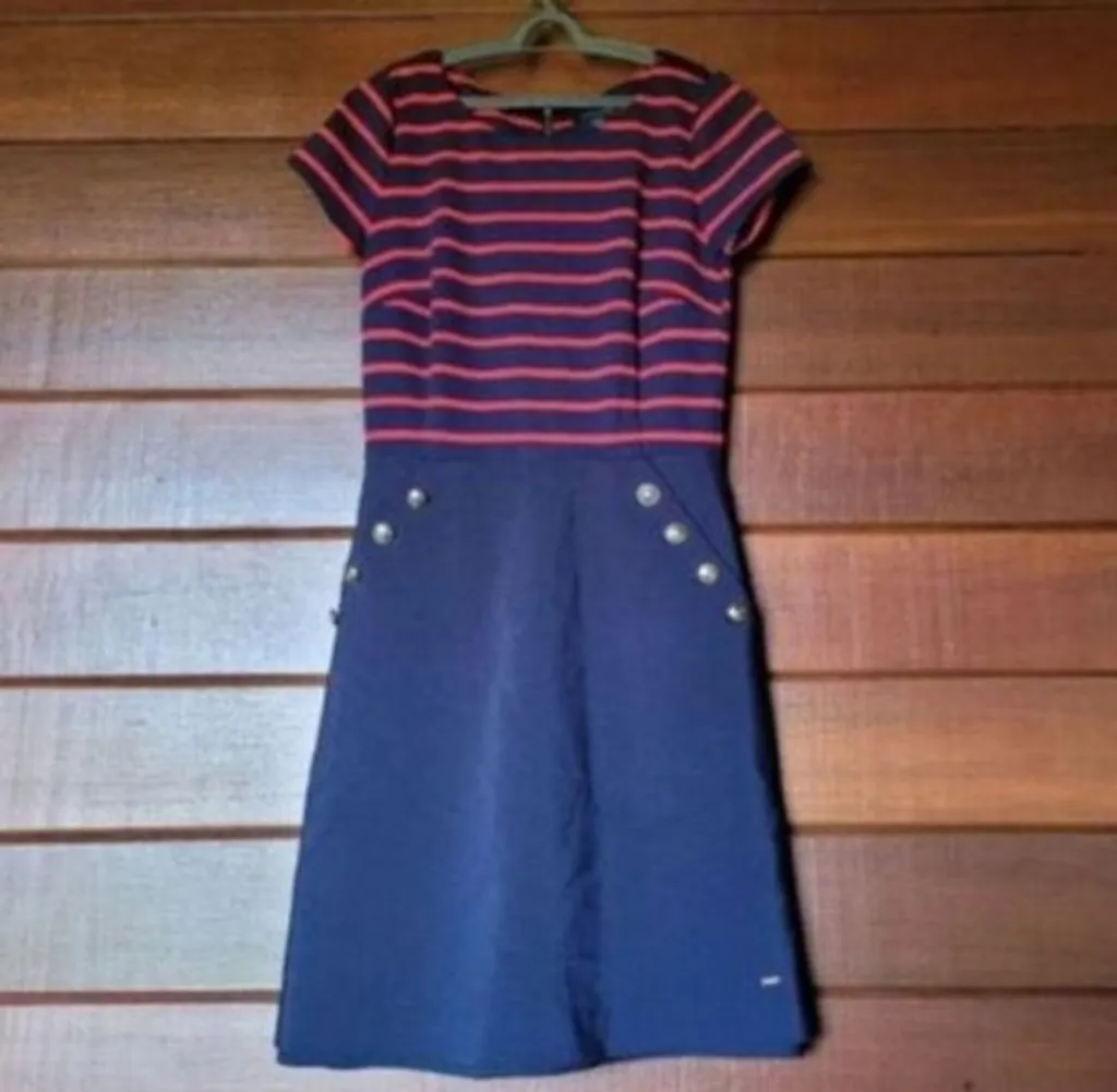 charmoso e sofisticado, este vestido da tommy hilfiger é perfeito para quem ama elegância com um toque navy clássico. o modelo combina listras azul-marinho e vermelhas na parte superior e saia lisa azul-marinho, super chique. medidas: 88 cm de busto x 72 cm de cintura x 96 cm de quadril x 92 cm de comprimento. envio: somente às sextas-feiras.