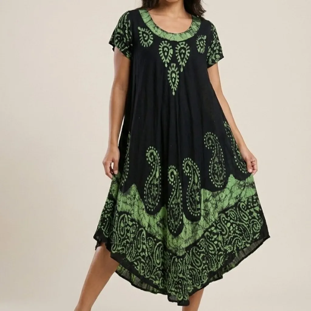 Vestido modelo trapézio indiano, na cor preto com verde, detalhe bordado na frente, tamanho EG na etiqueta em viscose, da marca Palak. Busto: 120 cm Cintura: 150 cm Quadril: 200 cm Comprimento: 130 cm