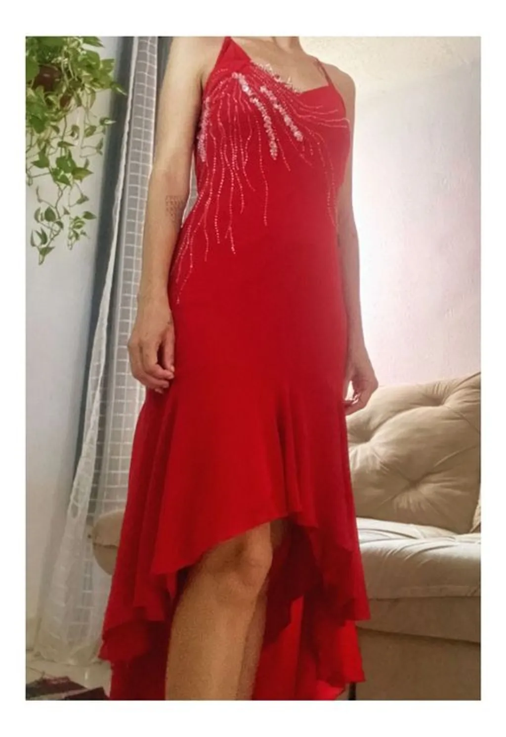 em vermelho vibrante, com aplicações de pedrarias delicadas e um broche luxuoso na parte frontal as alças trançadas uma fina e outra mais grossa e o decote nas costas em formato de coração o corte é assimétrico, mais curto na frente e com cauda longa atrás, acompanhado de babado medidas: busto 38 cintura 40