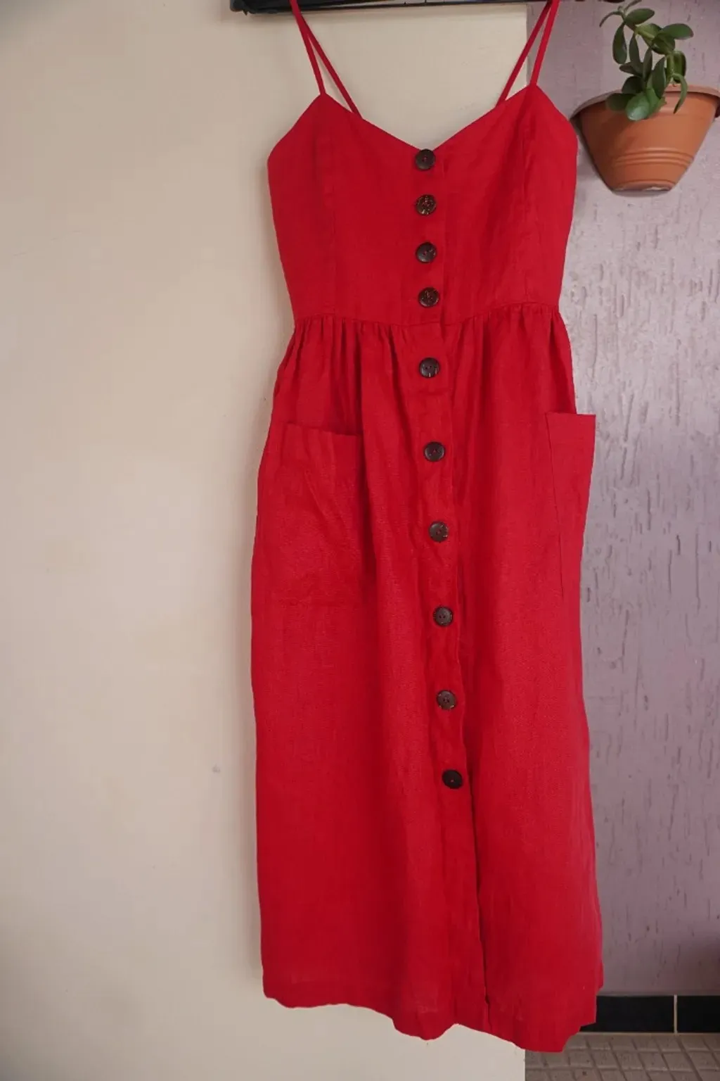 vestido vermelho de linho puro de alça com cinto de couro