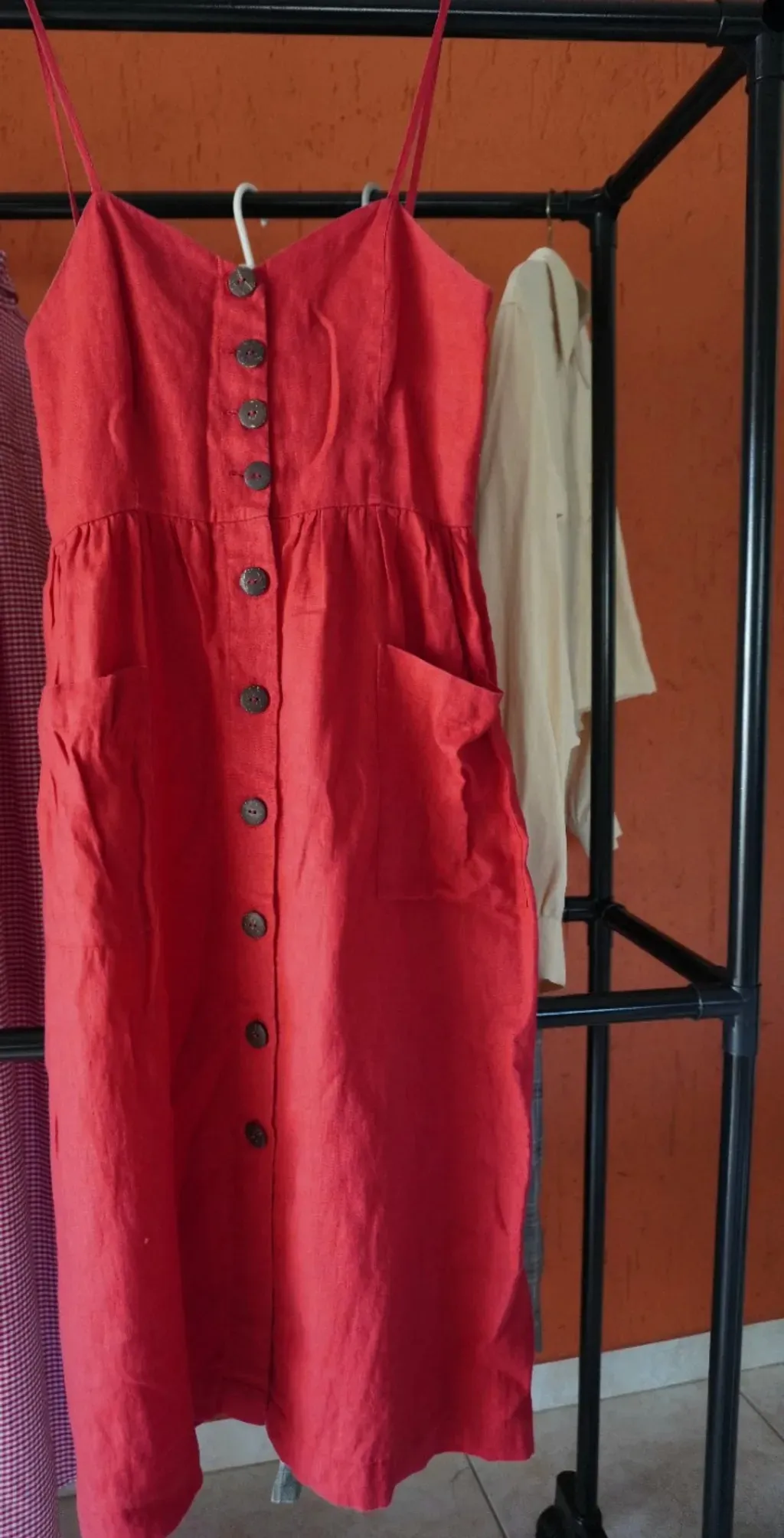 novo acabamento perfeito vestido com botões de alcinha midi tecido linho 100% tamanho g cor vermelho cintura 90cm busto 100cm. comprimento 114cm (medindo com alcinha) parte se cima de tecido duplo. vem com cinto de couro crazy horse com mini bolso (tamanho para cartão), novo